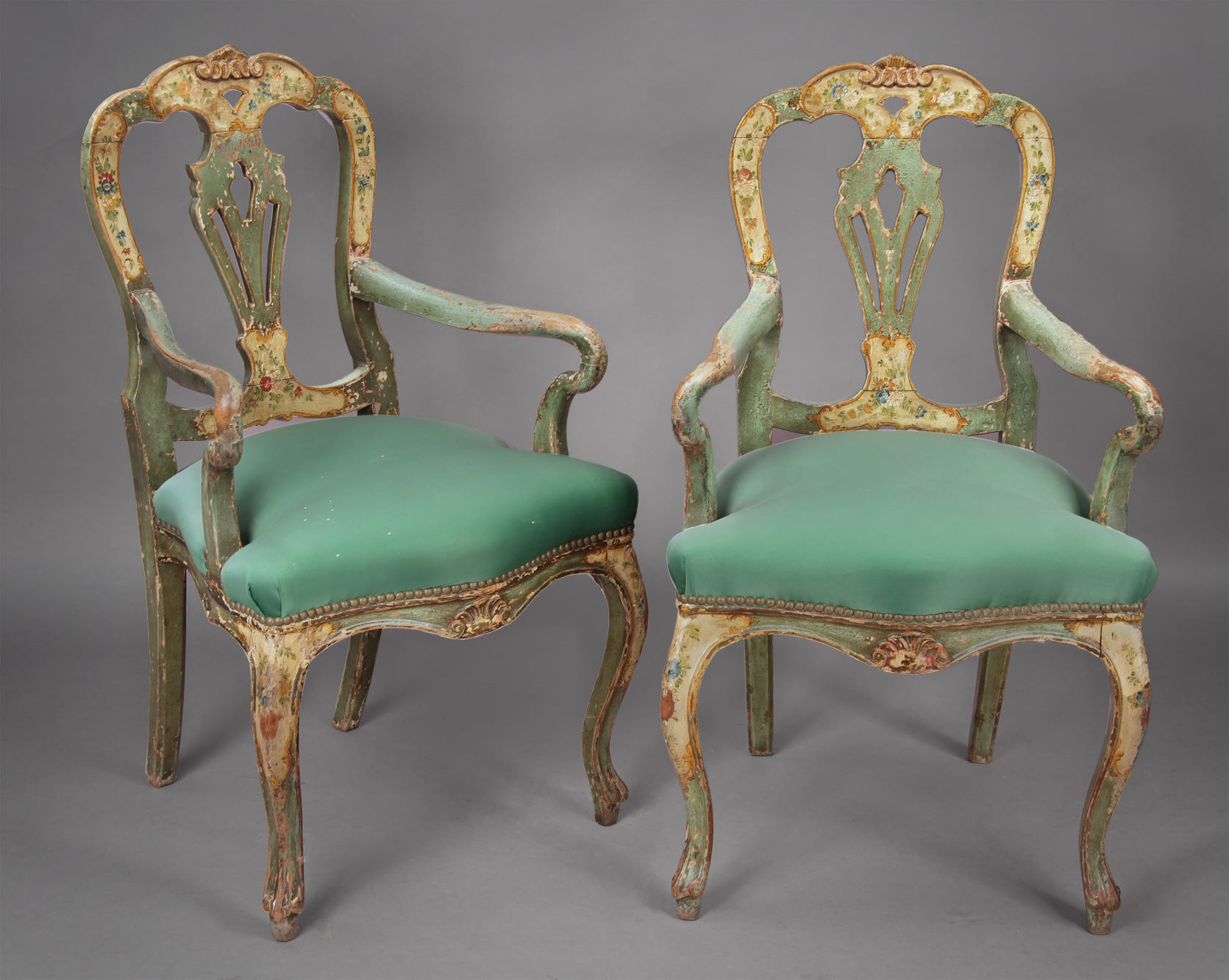 Armazones de madera estucada y pintada en tono verde. Decoración pintada a mano de reservas con flores y hojas sobre fondo beige. Respaldos abiertos con listón central calado. Asientos tapizados en género verde.