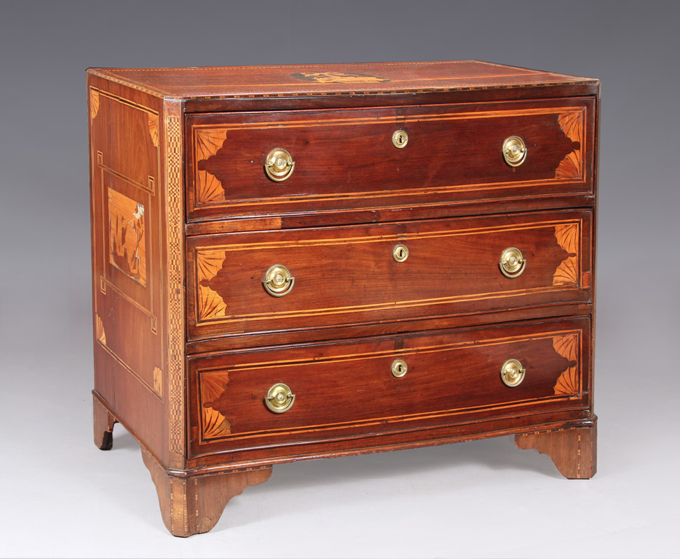 Realizada en madera enchapada en caoba. Filetes y marquetería en maderas frutales. Reservas en la tapa y los laterales con canasto florido y escenas de cacería. Tres amplios cajones con suave movimiento ondeado. Tiradores y bocallaves circulares de bronce.