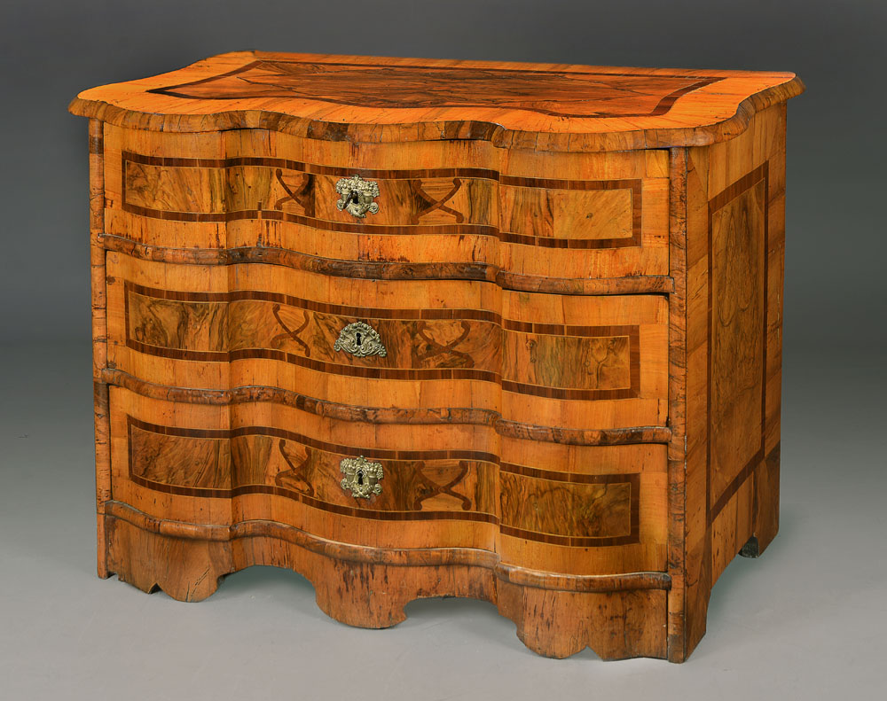 Circa 1750. Interesante cómoda de tres cajones. Construida en madera laminada en nogal y raíz. Filetes de palisandro formando reservas. Frente elegantemente ondeado. Bocallaves de la época finamente cincelados, el del medio con diferentes motivos.