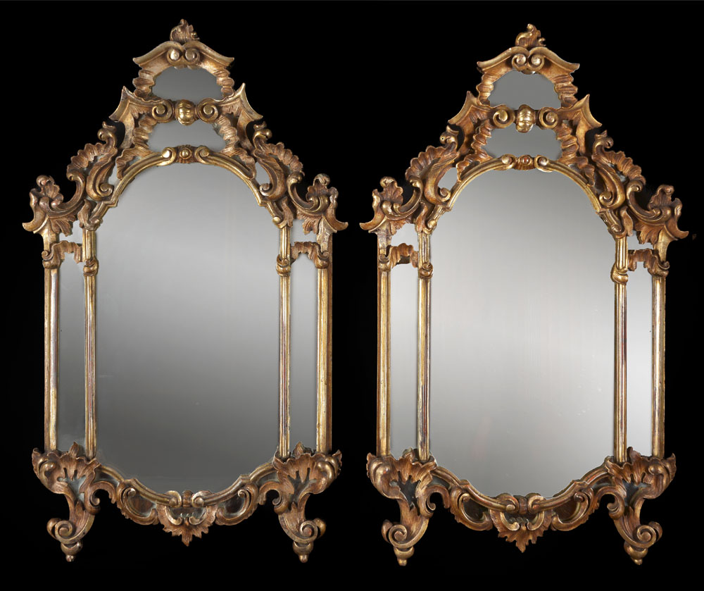 Espejos de forma irregular. Luna central rodeada por otras de menor tamaño. Enmarcamientos de madera con tallas en relieve dorada a la hoja y patinadas.