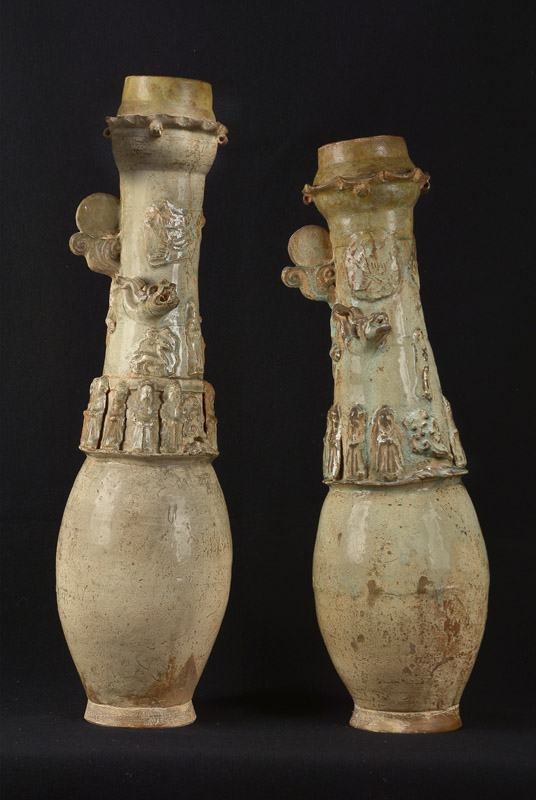 Dinastías Song 960-1279 y Yuan 1279-1368. Alfarería recubierta por un esmalte celadón. Partes en relieve en los cuellos, diferentes en cada pieza. Algunas antiguas restauraciones.