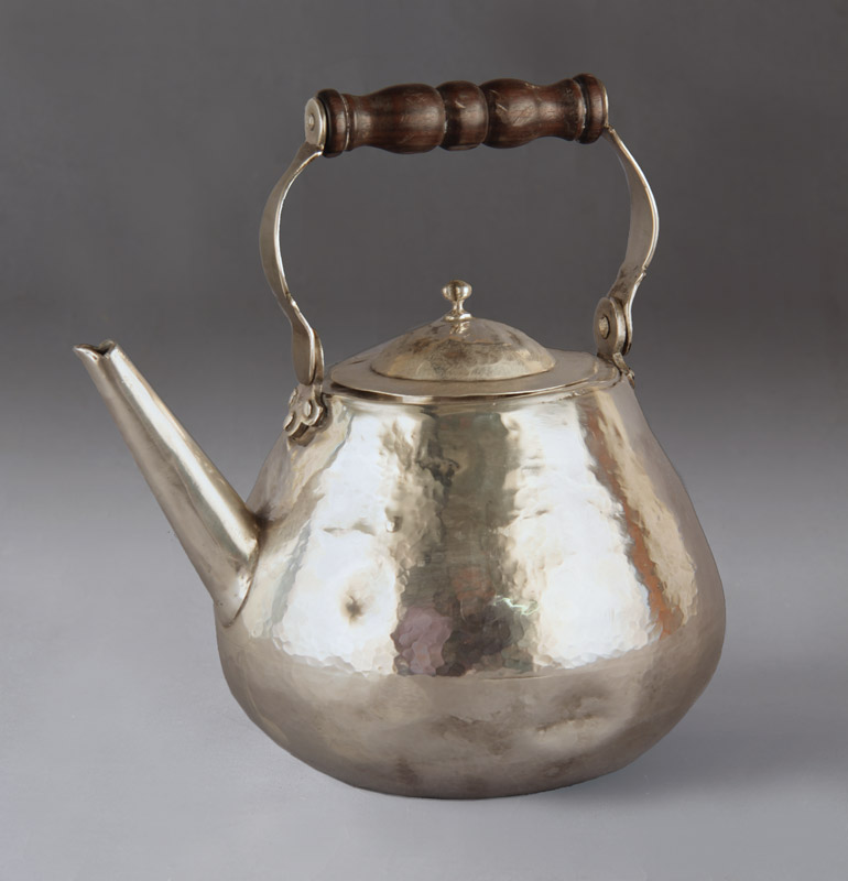 Punzón de platero D. PINTO encerrado en ovalo en el reverso de la base. Pieza de plata martillada. Recipiente con monograma suavemente grabado "J de J" en el frente. Tapa con parte central convexa. Asa movible con agarradera superior de madera torneada. Algunas averías.