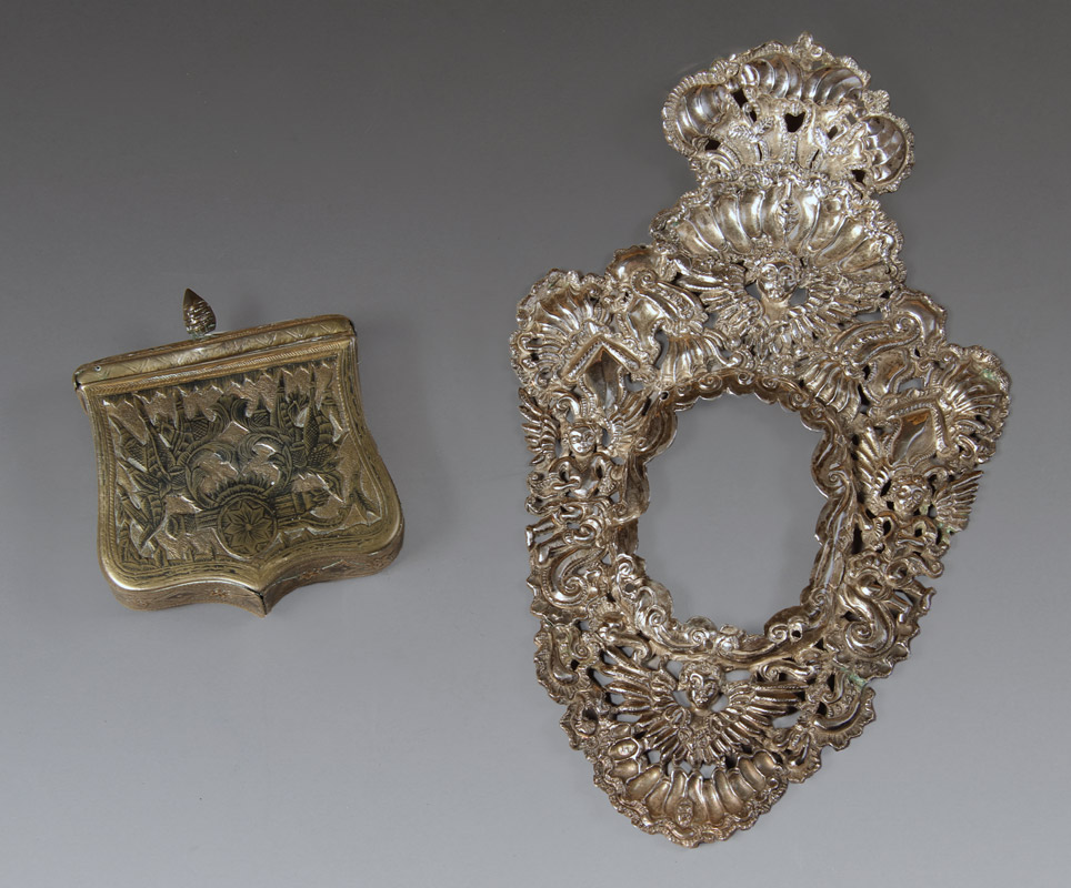 Realizado en plata repujada y calada. Pieza en forma de escudo coronado con orificio central porta imagen. Decoración de ángeles y motivos vegetales.