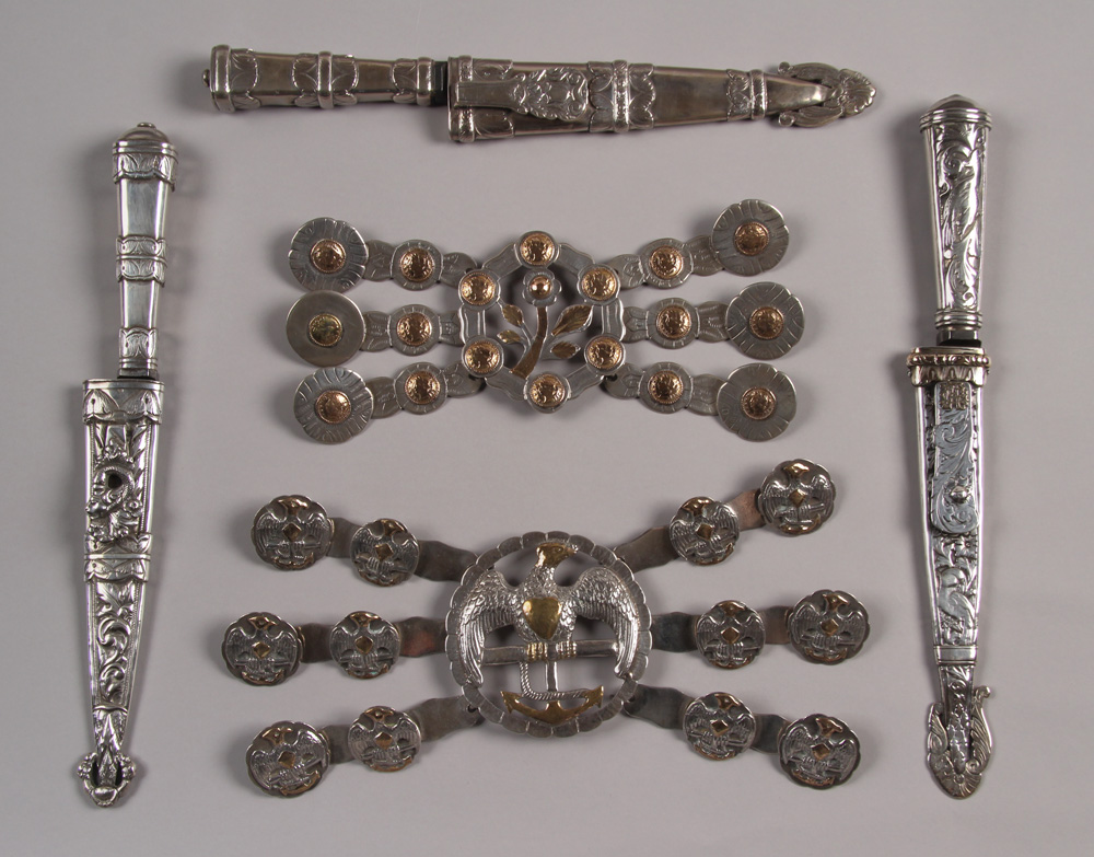 Centro cincelado y calado con figura de 谩guila sobre ancla en relieve, interpretaci贸n criolla del escudo de la ciudad de Buenos Aires. Seis ramales laterales lisos con botones centrales y prendeduras del mismo dise帽o que la hebilla. Lleva punz贸n de platero ARGUELLO en el reverso.