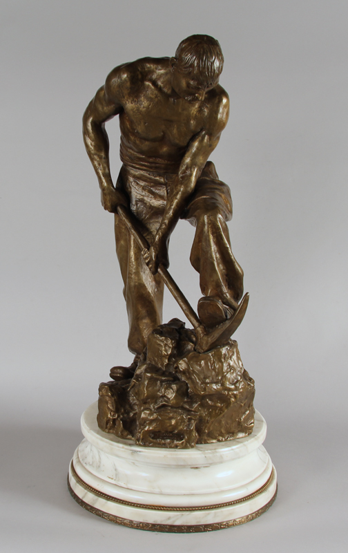 Escultura de bronce recubierta por una pátina dorada. Firmada P- MOREAU VAUTHIER en la base. Apoya en una base alta de mármol blanco veteado. Aro de bronce perlado y otro cincelado.