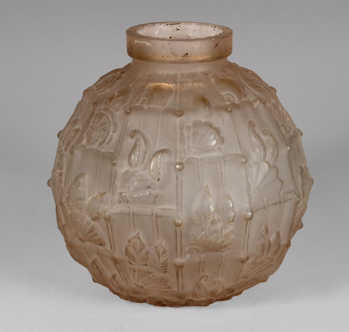 Cuerpo globular. Vidrio esmerilado con decoración en relieve. Firmado MULLER Fres., Luneville.