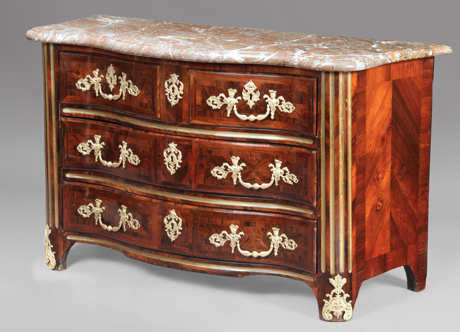 Ejecutada en madera enchapada en caoba y palisandro. Frente ondeado con dos amplios cajones inferiores y otros dos superiores más chicos a una misma altura. Acanalados verticales y horizontales laminados en bronce. Tiradores, bocallaves y sabots de bronce cincelado y dorado. Gruesa tapa de mármol rosa veteado con borde moldurado.