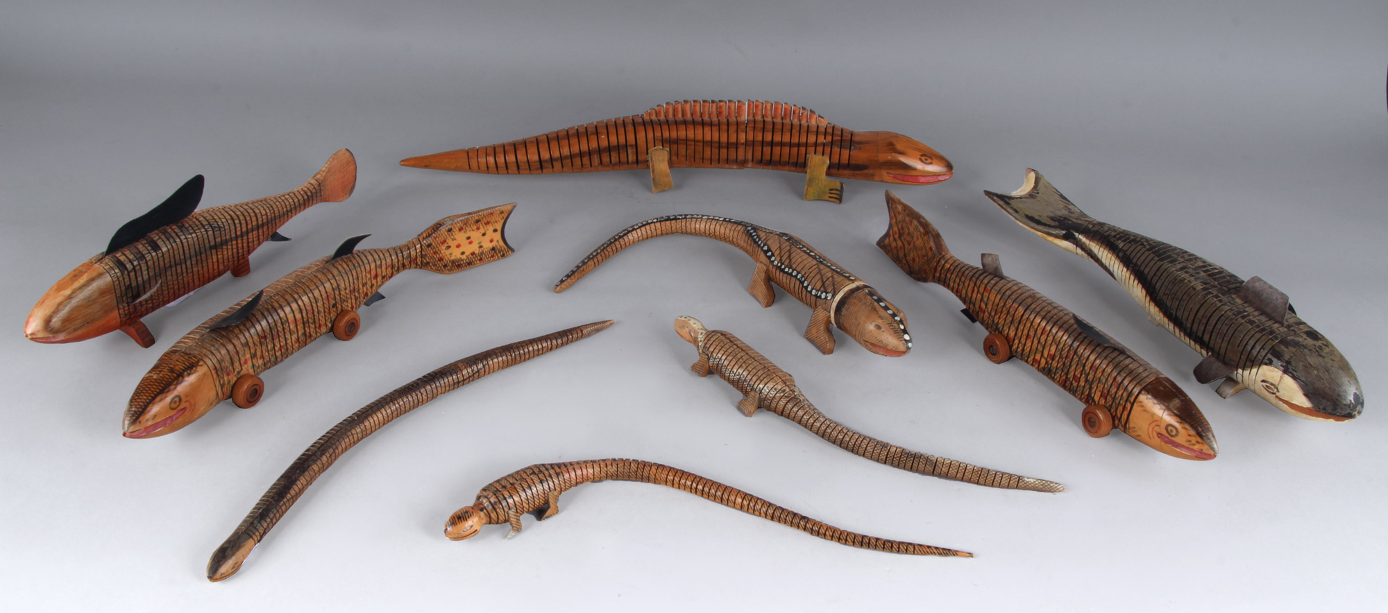 Piezas articuladas. Representan a diferentes peces y reptiles. Decoraciones pintadas a mano.