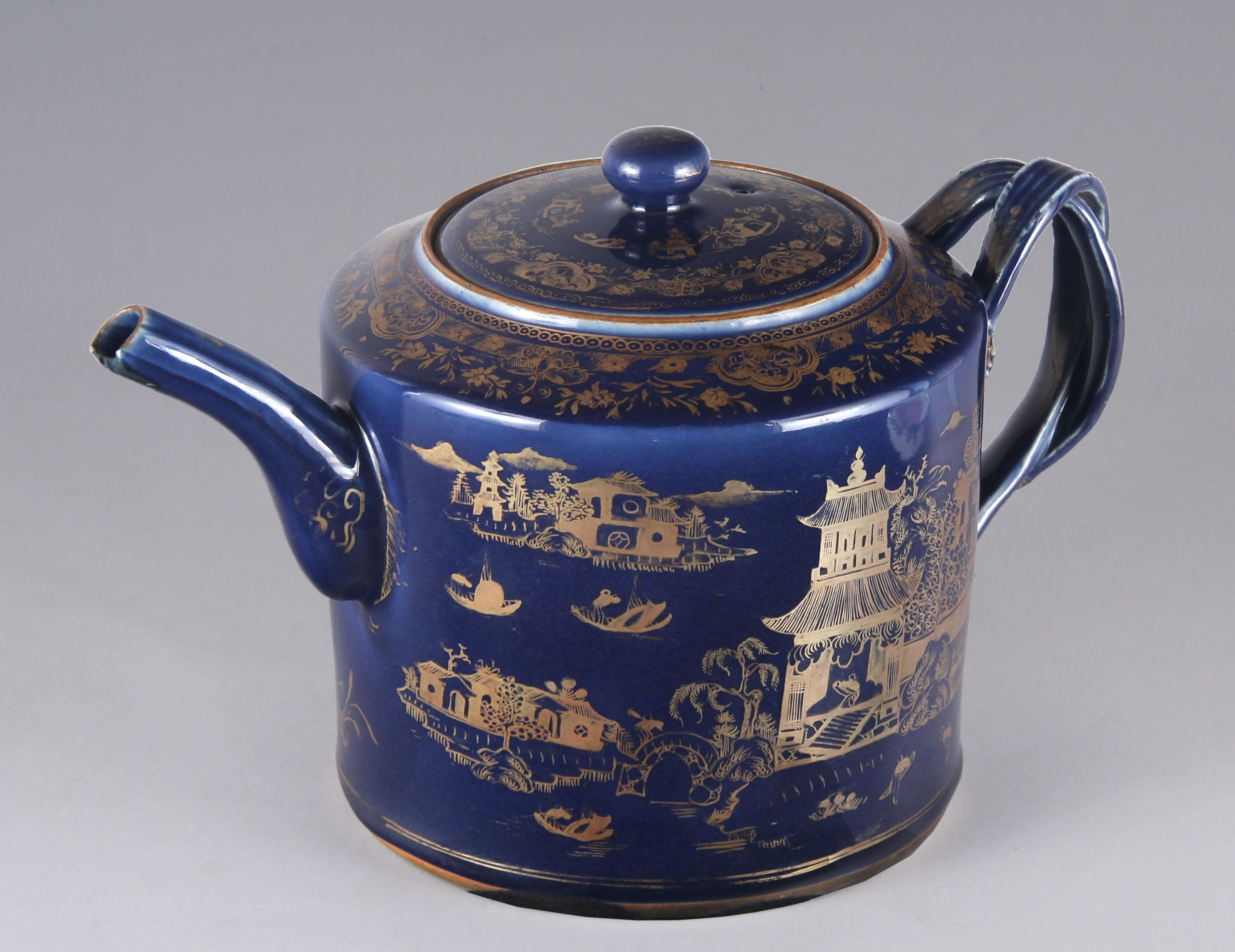 Dinastía T'SING. Epoca Kang Hsi 1662-1722. Porcelana china cubierta en esmalte "bleu poudre". Decoración oriental oro representada por paisaje con construcciones. Asas lateral en forma de gruesas cintas entrecruzadas. Cascadura en la parte inferior del pico vertedor.