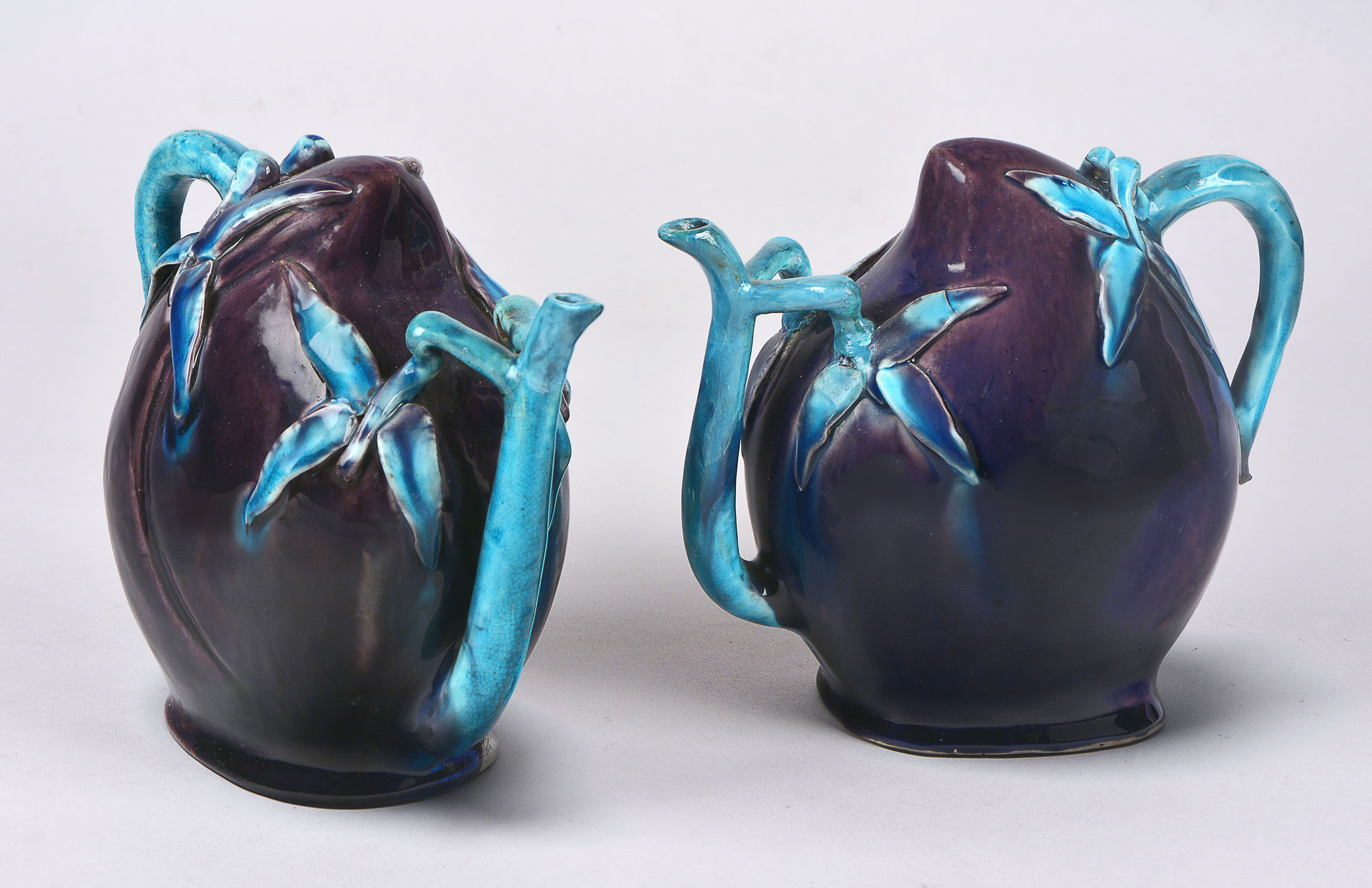 Dinastía T'SING. Epoca Chien Lung 1736-1795. Cubierta de esmalte aubergine. Ramajes en relieve, asa lateral y pico vertedor recubiertos por esmalte bleu turquoise. Pequeña restauración en el ramaje y pico vertedor.