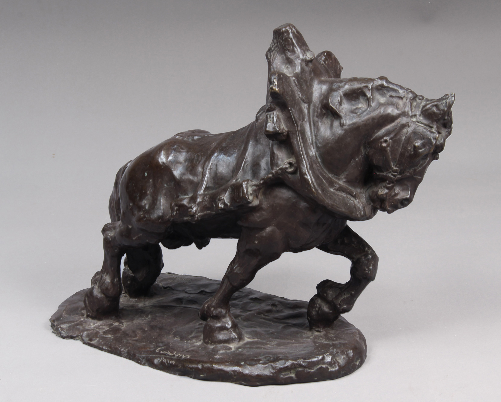 Escultura de bronce con pátina oscura. Firmada CARDONA, París, en la base. Base rectangular de mármol veteado.