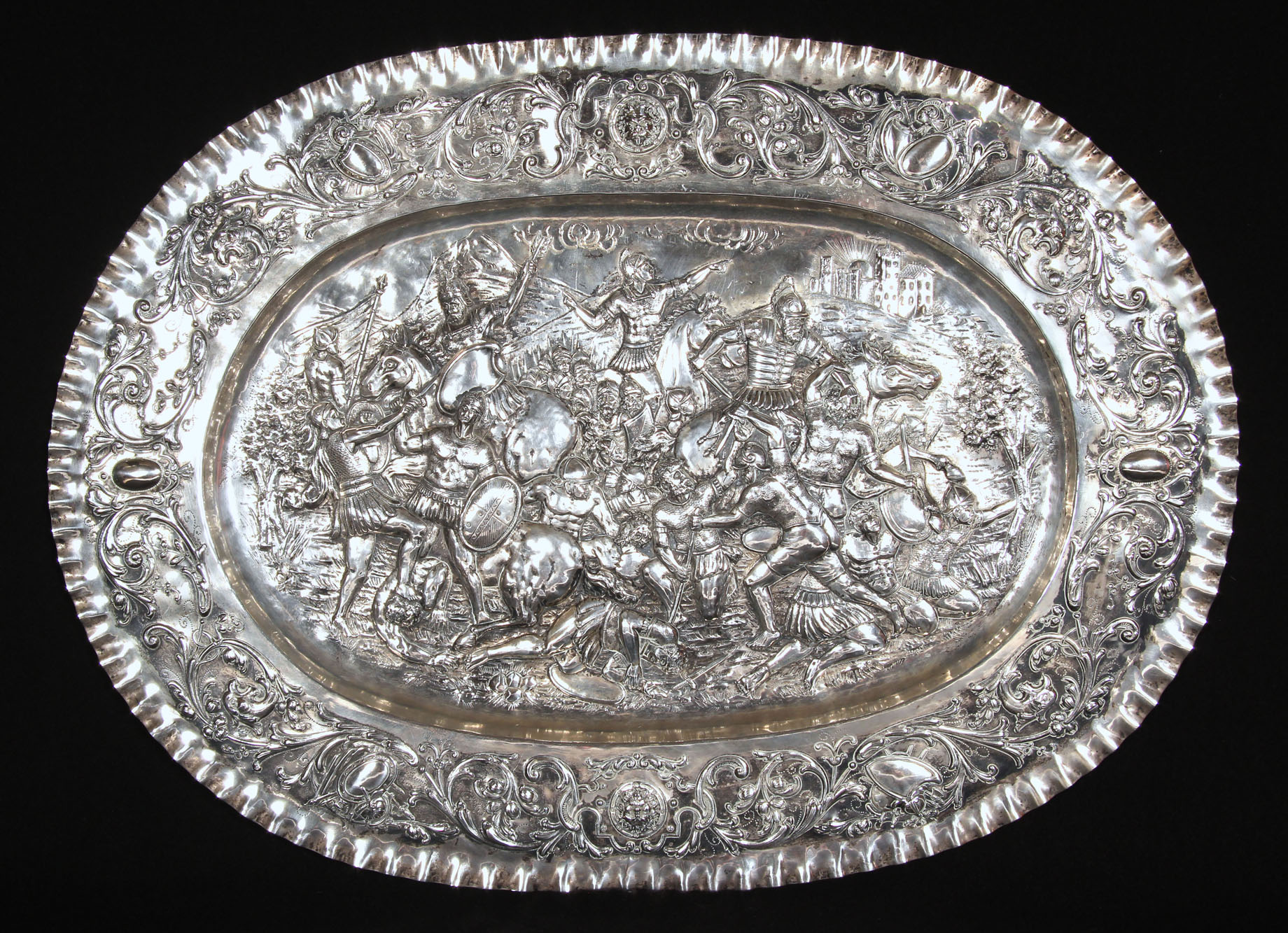 Centro repujado con escena de batalla. Ancha guarda con motivo de hojas, escudos y cabezas de animales mitológicos. Borde ondeado.