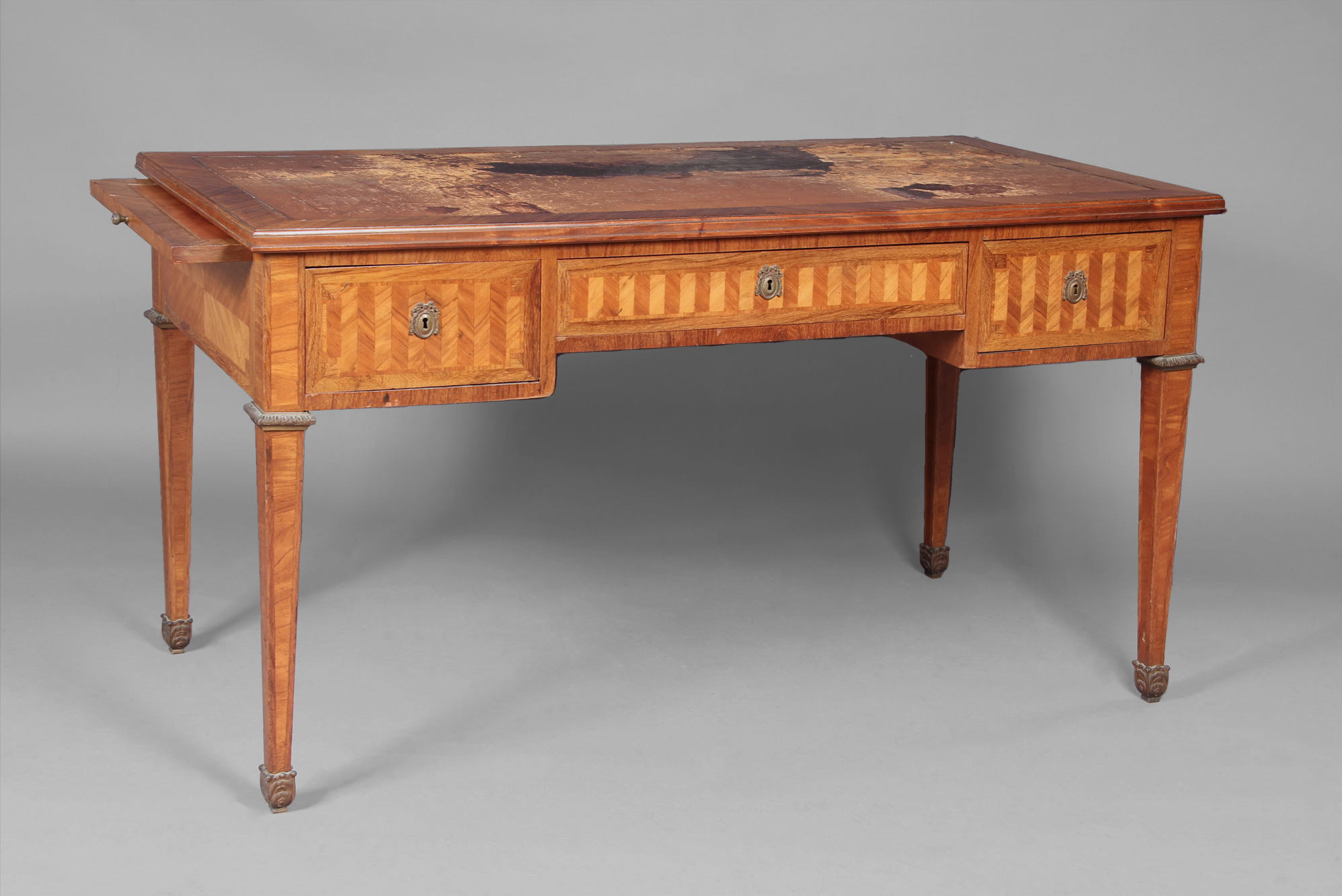Madera enchapada en nogal y palisandro. Tapete de cuero manchado. Frente con tres cajones. Tiretes laterales. Bocallaves, capiteles y sabots de bronce cincelado y patinado.