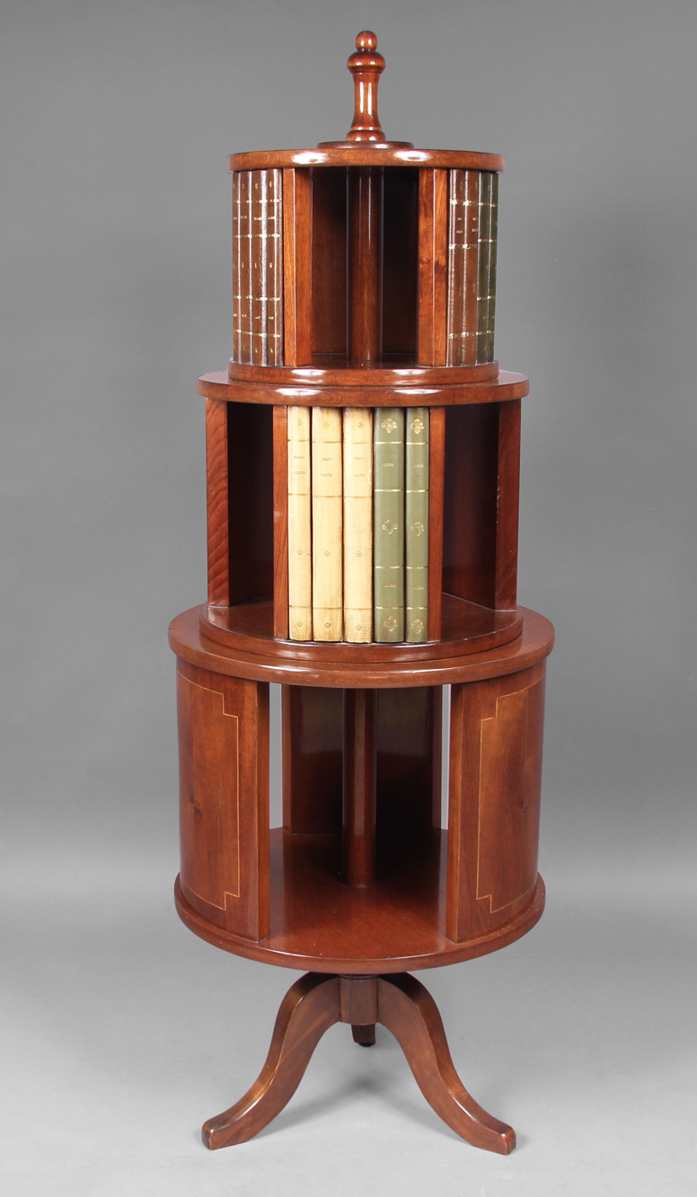 Madera enchapada en caoba. Tres módulos superpuestos de tamaños progresivos, los dos superiores decorados con lomos de libros. Tres apoyos.