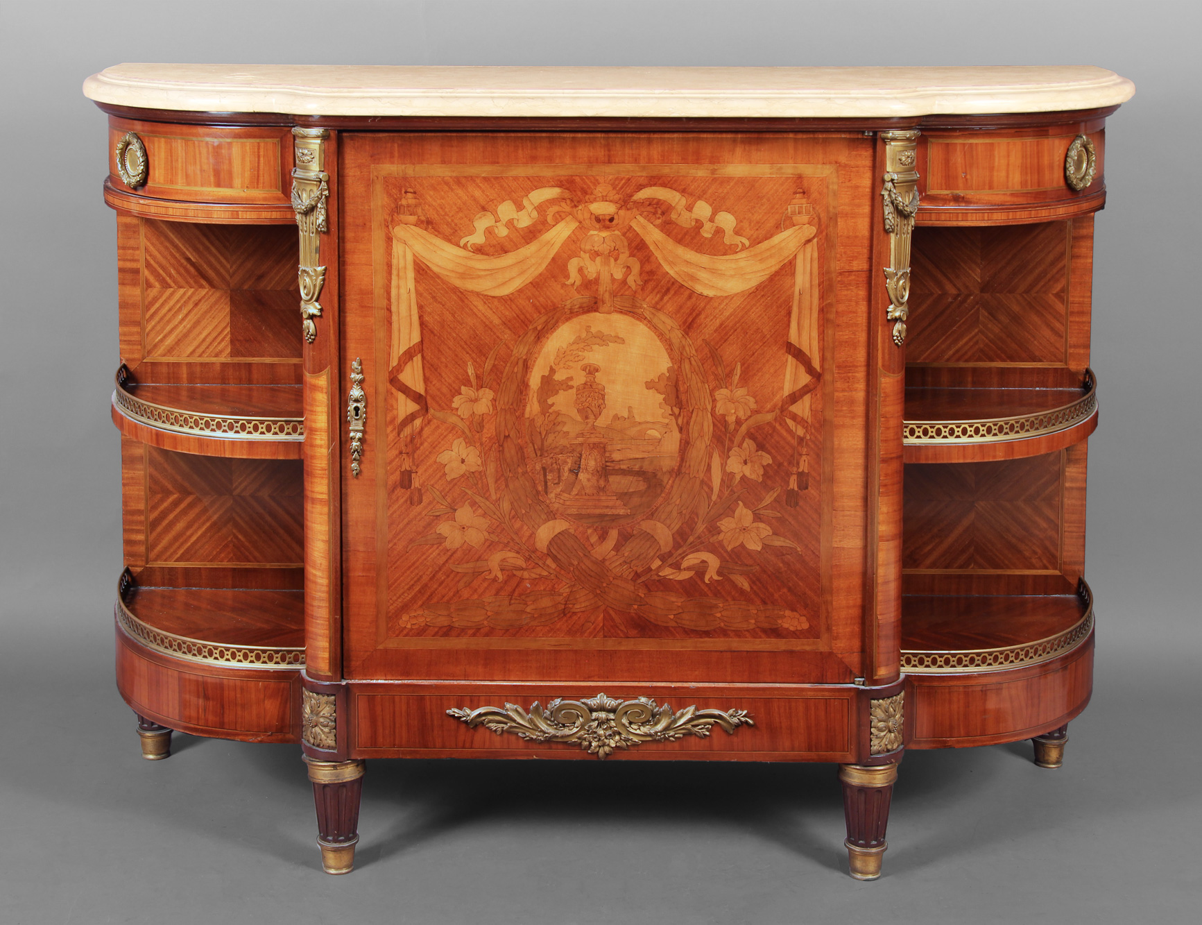 Construido en madera enchapada en caoba y palo de rosa. Puerta central con marquetería de telas, guirnaldas y flores encerrando un paisaje. Estantes y cajones laterales curvos. Cuatro apoyos acanalados. Caídas, adornos, barandas y tiradores de bronce cincelado y dorado. Tapa de marmolina color beige.