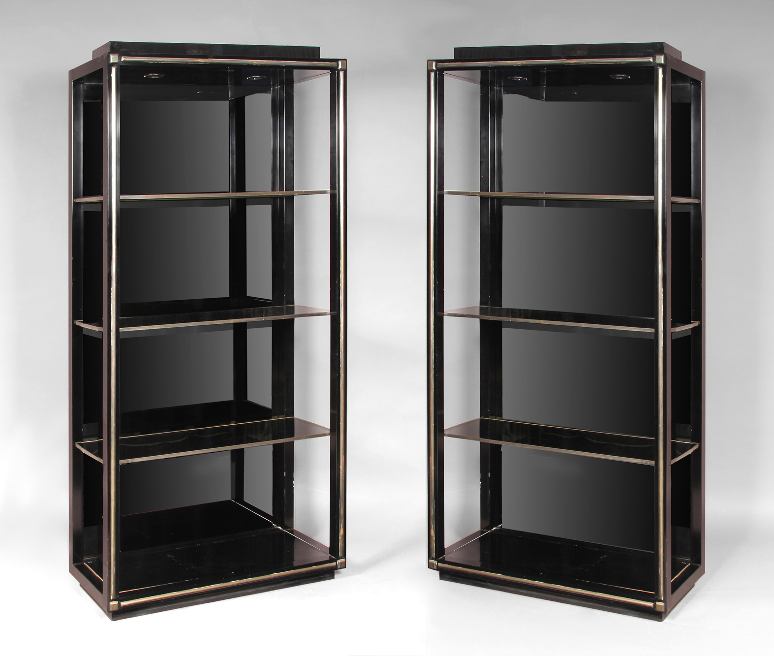 Estructura de caño cuadrado pintado de negro y varillas de bronce empavonado. Cada una presenta tres estantes de vidrio fumé y uno inferior de madera laqueada. Fondo de espejo y cornisa con iluminación.