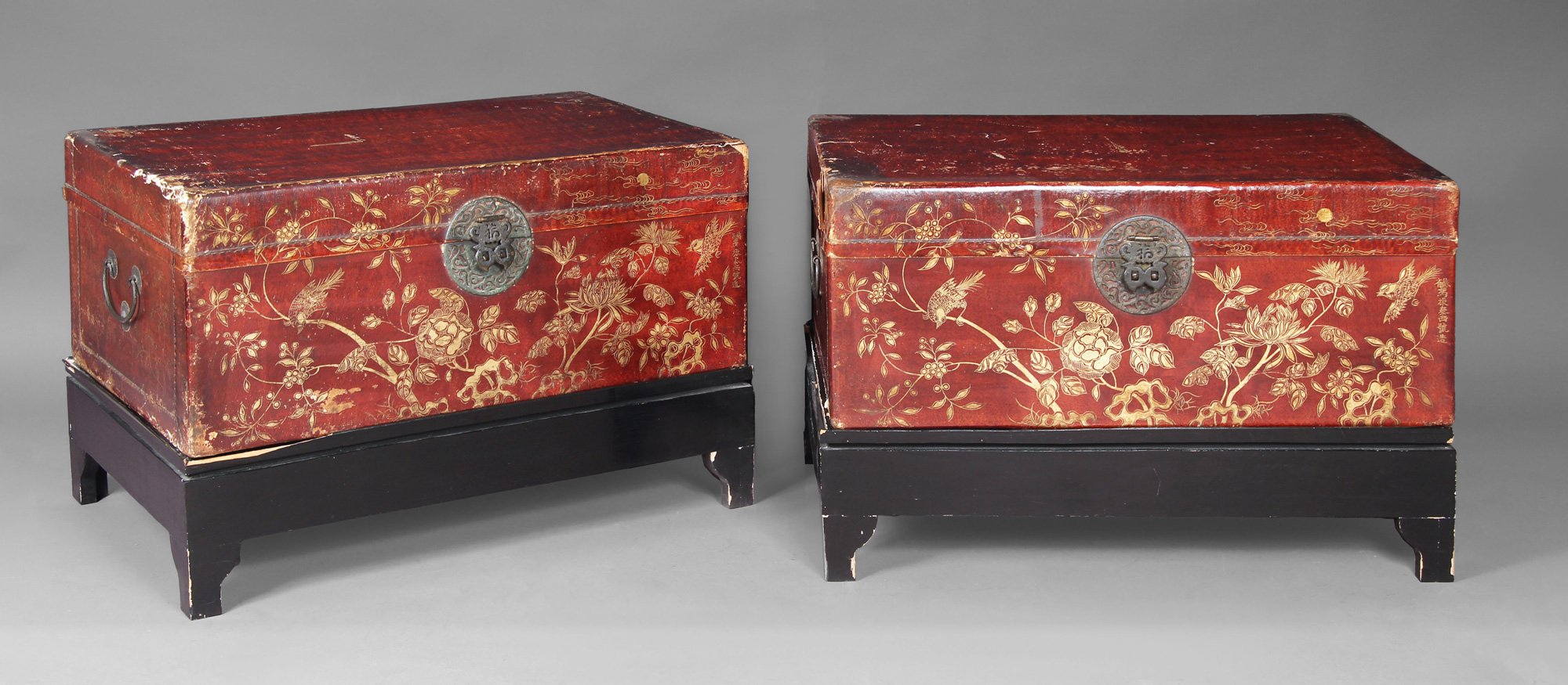 Recubiertos en pergamino patinado en tono lacre. Decoración oro representando ramajes floridos y aves. Herrajes de hierro calado. Bases de madera pintada de negro con pequeños faltantes.