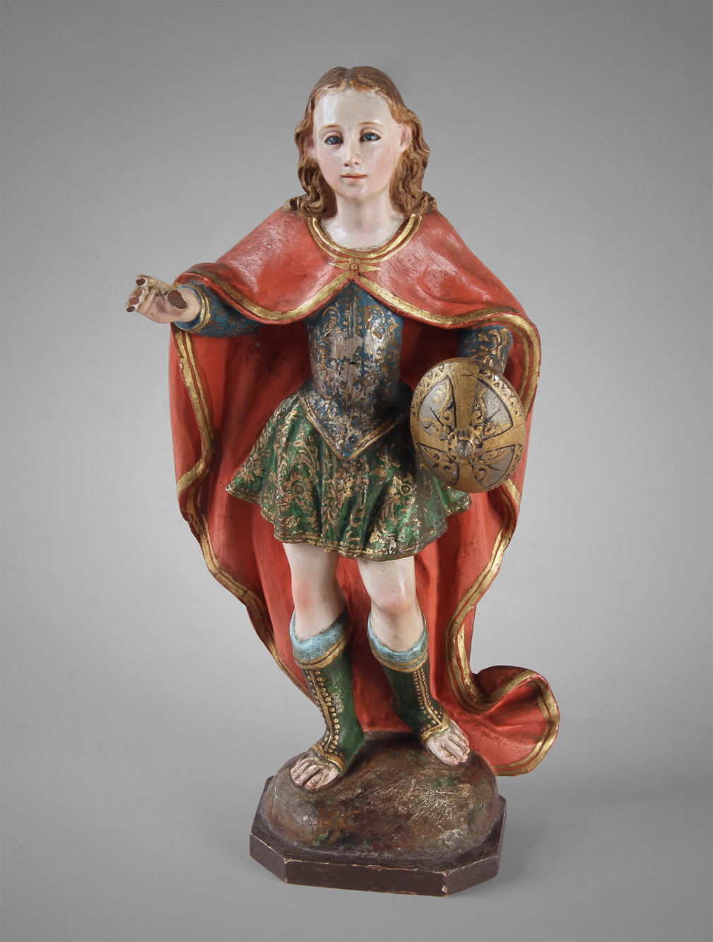 Antigua talla religiosa de madera estucada y policromada. Ojos de vidrio. Faltante de dedos y espada en la mano derecha.