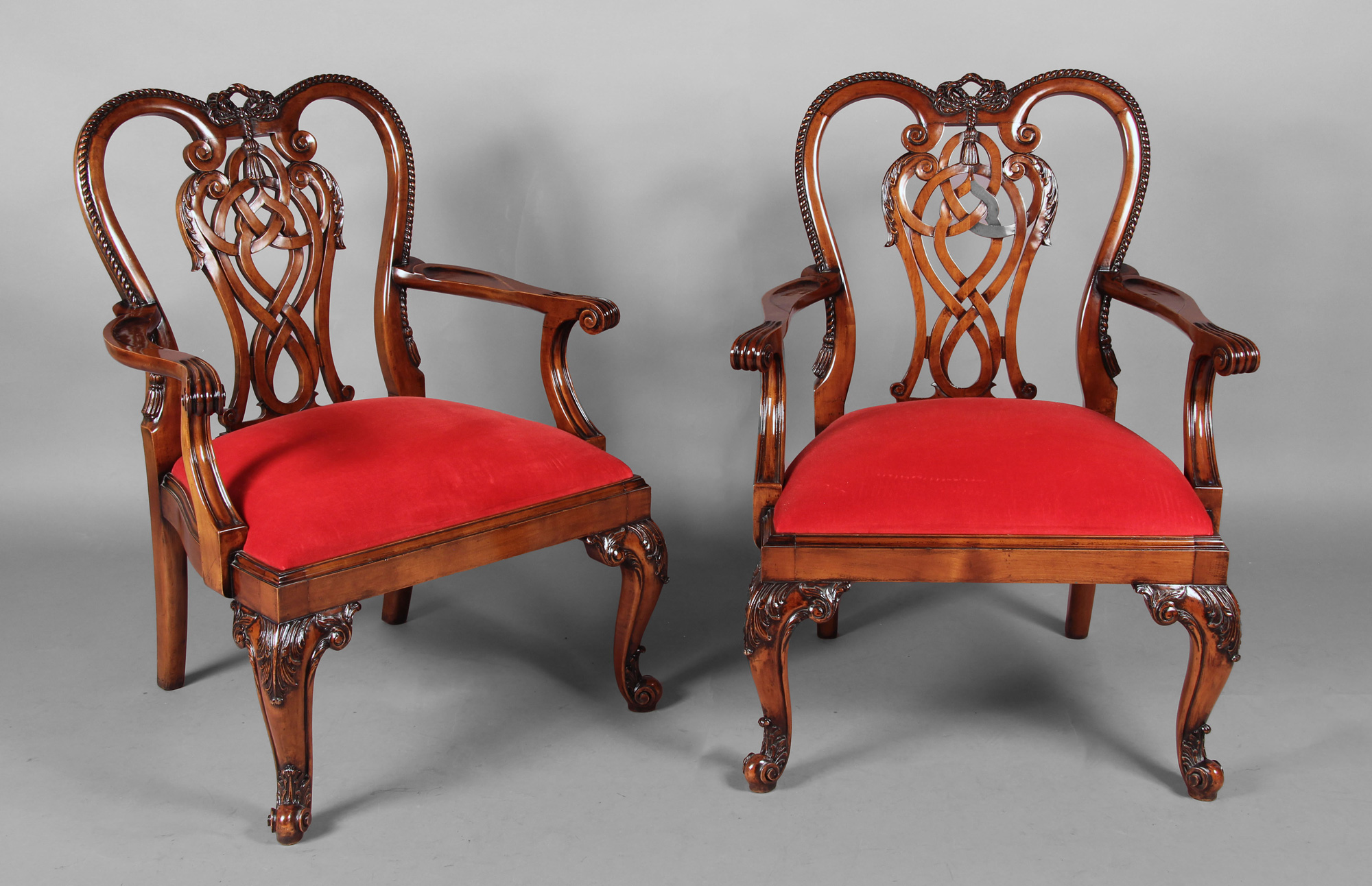 Armazones de nogal. Decoración tallada de sogas y hojas. Asientos a bastidor tapizados en pana roja.