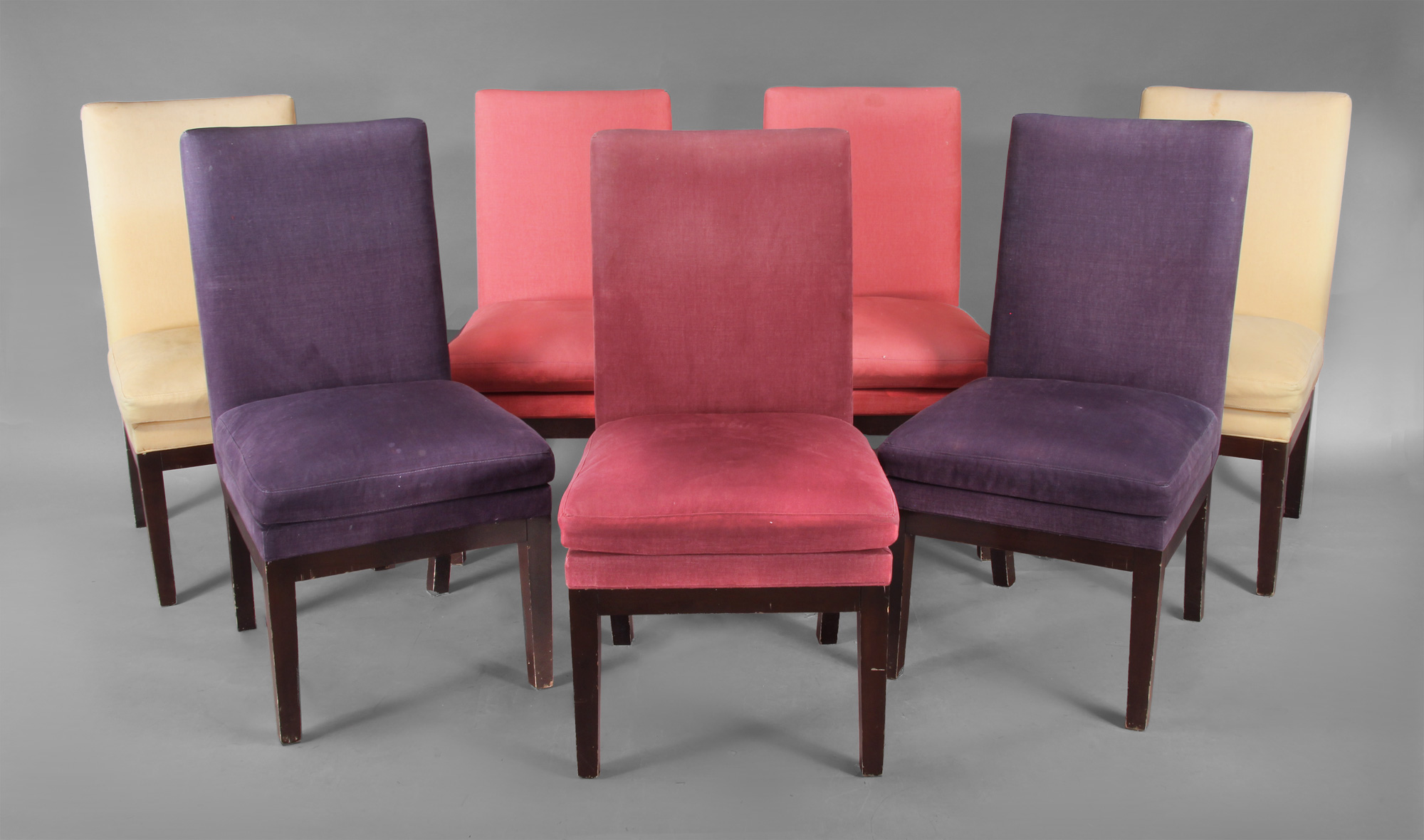Apoyos de madera lustrada. Respaldos, asientos y almohadón de los asientos tapizados en género liso, tres color violeta, tres ciruela, tres rosa y tres mostaza.