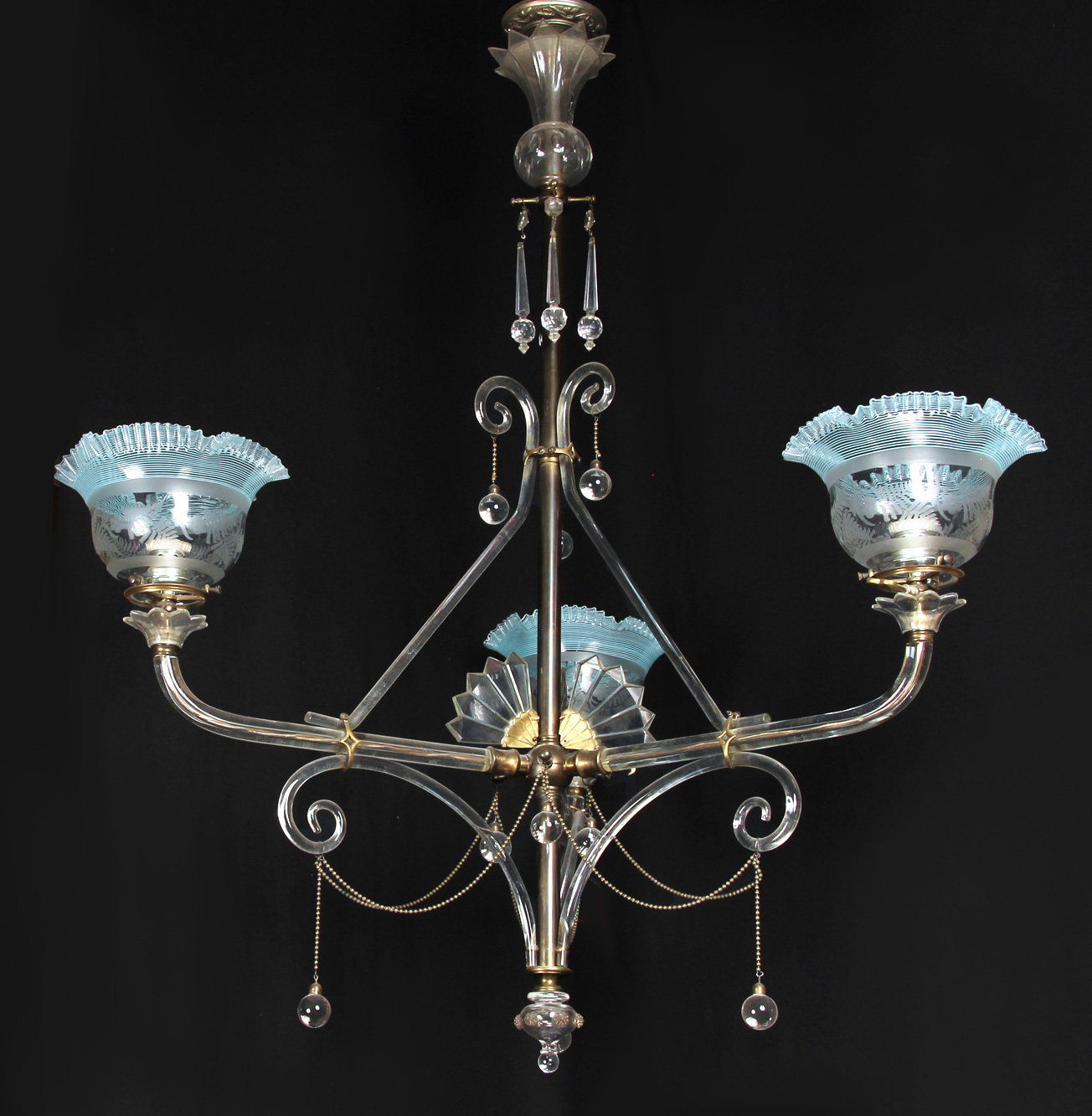 Eje central y monturas de bronce patinado. Tres brazos rectos terminados en una luz cada uno. Tulipas grabadas con estrías celestes. Varillas curvas, cadenillas y gotas completan la decoración.