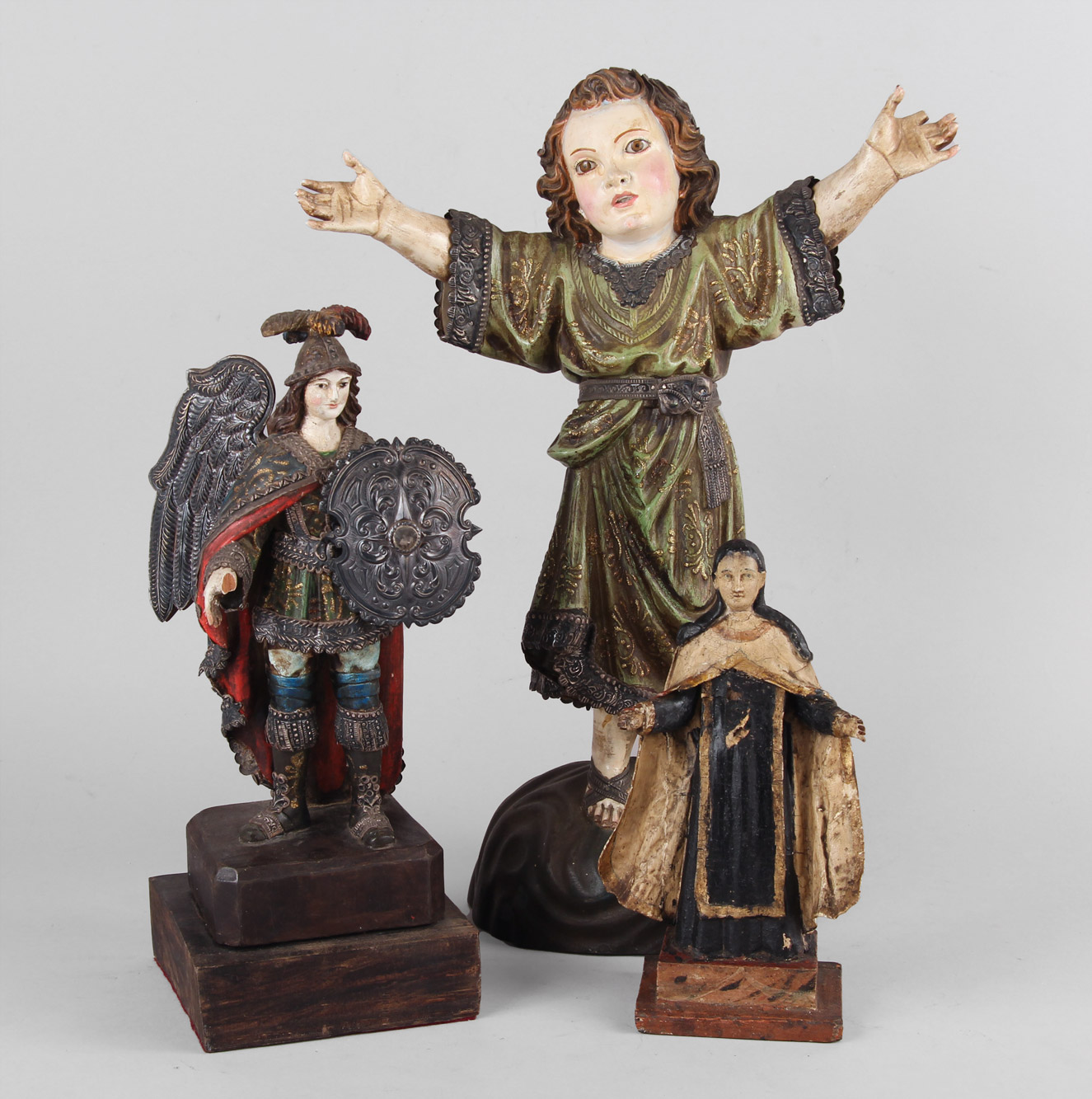 Figura de "San Miguel Arcángel" en madera policromada con realces dorados y partes en chapa de plata repujada, avería en una mano. La otra pieza en una figura de "Santa Teresa de Avila" en madera y tela estucada y policromada, protegida por un fanal de vidrio con base de madera, faltantes en los dedos de las manos.