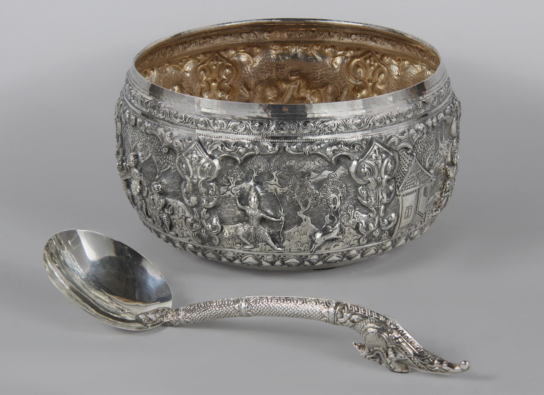 Plata martillada y repujada con decoración en relieve animada por personajes y animales. Interior vermeil. Cuchara repujada terminada en cabeza de dragón.