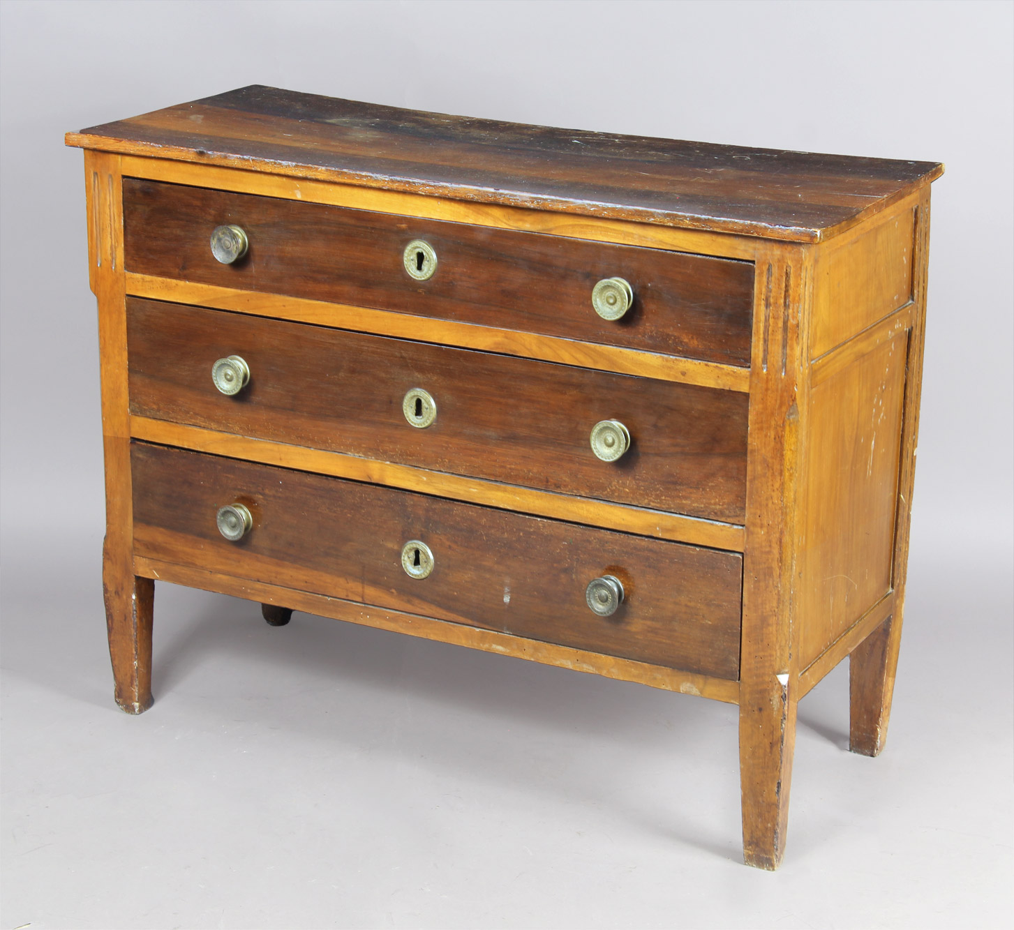 Ejecutada en madera enchapada en nogal. Frente recto con tres amplios cajones. Tiradores y bocallaves circulares de bronce cincelado, uno con faltante. Algunas antiguas marcas de polilla.