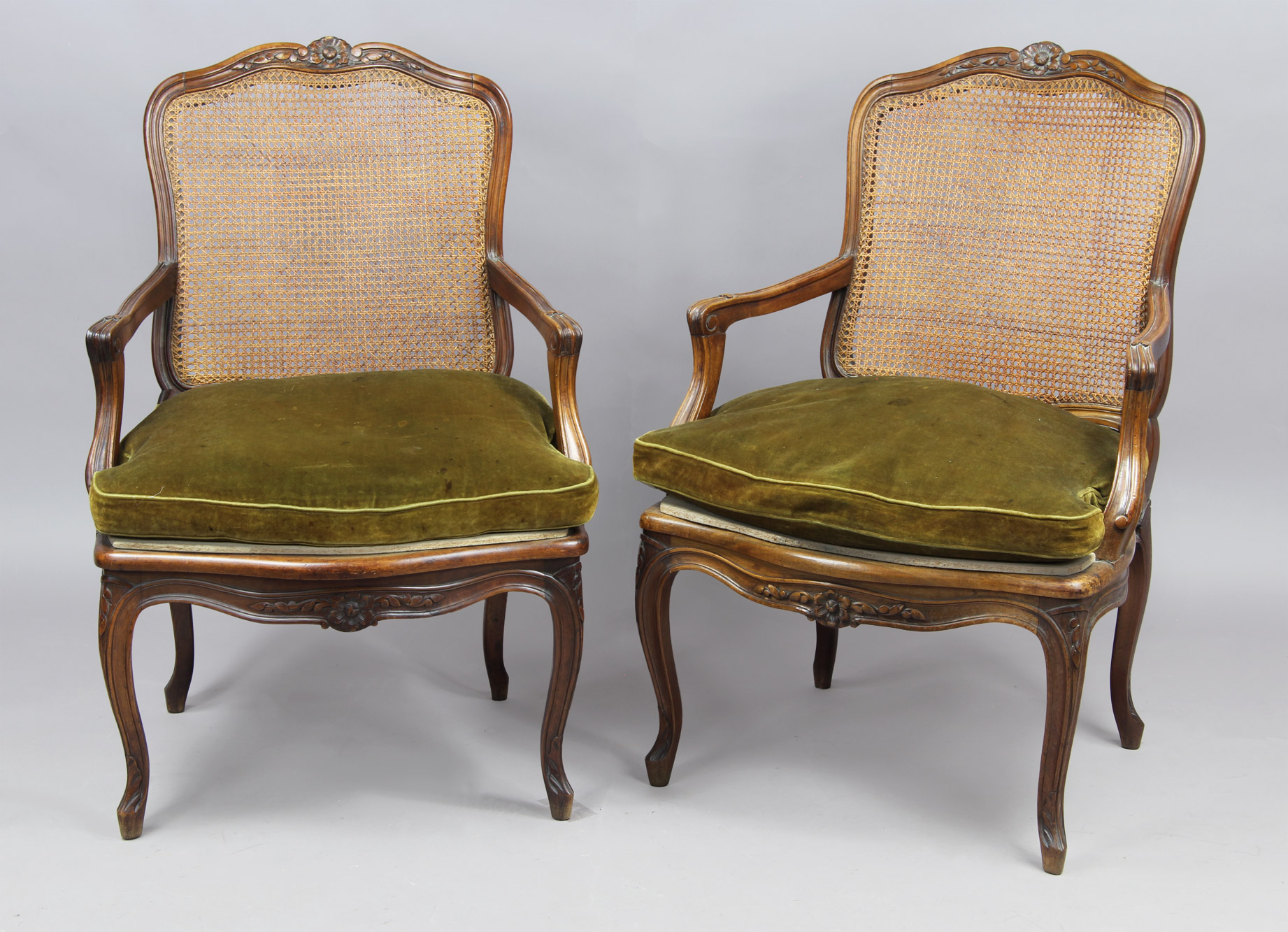 Armazones en madera de nogal. Talla de flores y hojas. Respaldos esterillados. Asientos con tabla de aglomerado y almohadón tapizado en pana verde.