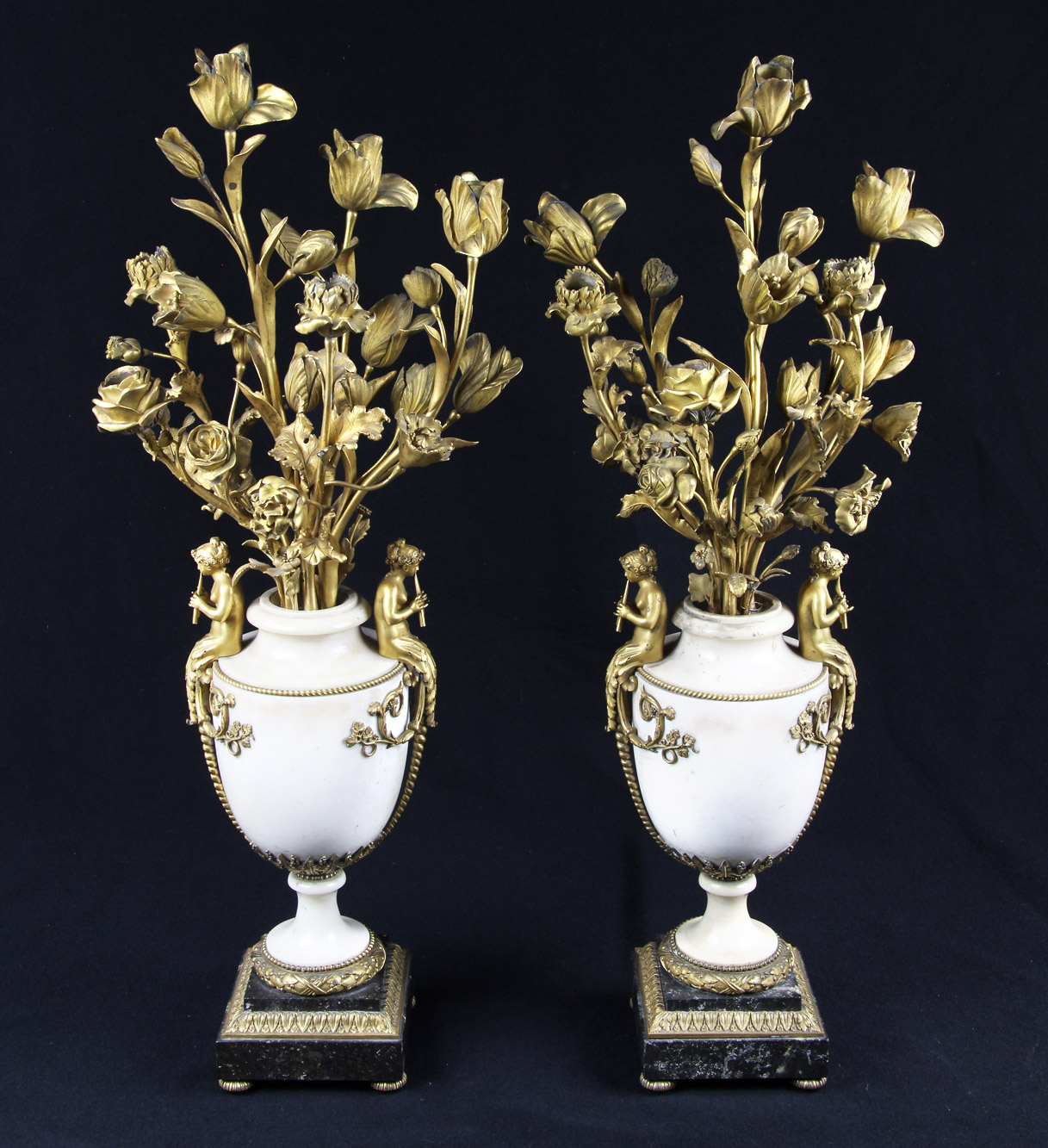 Piezas representando copones de mármol de Carrara con varas floridas de bronce cincelado y dorado. Seis flores forman los candeleros. Asas laterales representadas por ninfas tocando instrumentos de viento. Bases cuadrangulares de mármol negro veteado con pequeñas restauraciones.