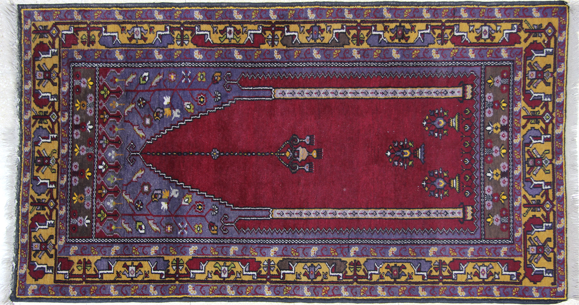 Alfombra de oración con diseño característico sobre fondo bordó y violáceo. Tres franjas, la central sobre fondo ocre, forman la guarda.