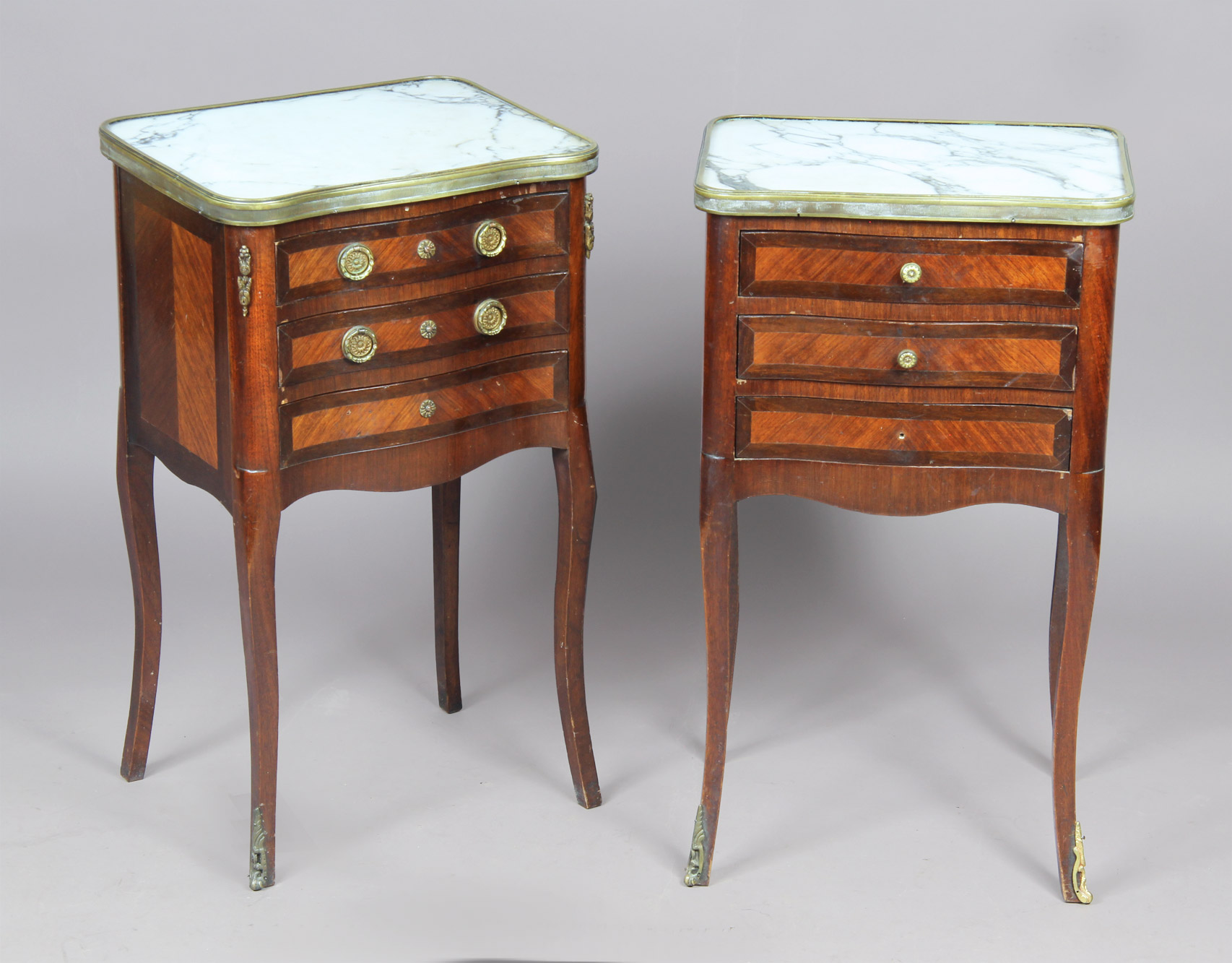 Enchapadas en caoba. Tres cajones. Tapa de mármol blanco veteado. Borde de las tapas, tiradores y sabots de bronce, algunos faltantes.