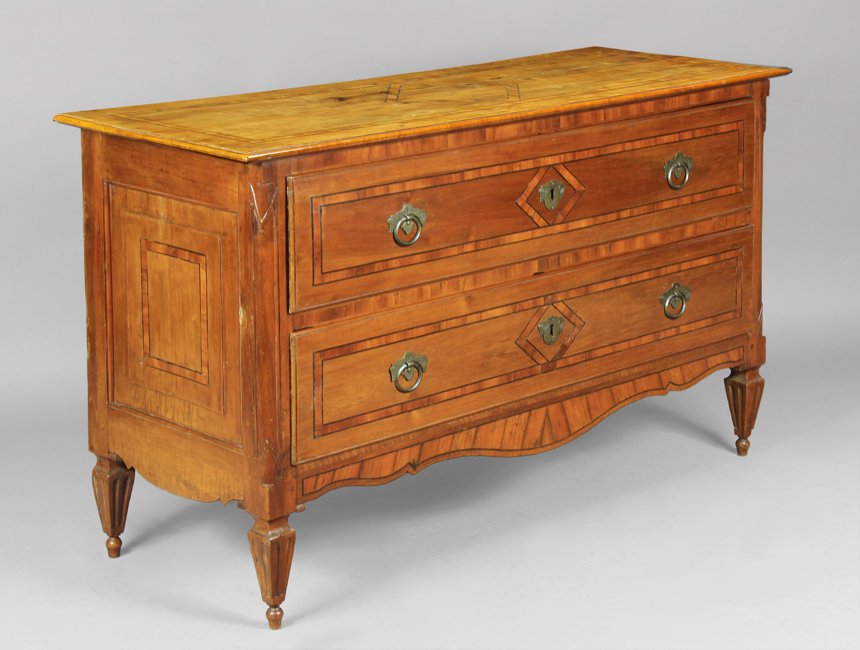 Ejecutada en madera emplacada en nogal. Frente con dos grandes cajones. Guardas de palo de rosa formando rectángulos y rombos. Apoyos acanalados. Tiradores y bocallaves de bronce recortado y patinado.