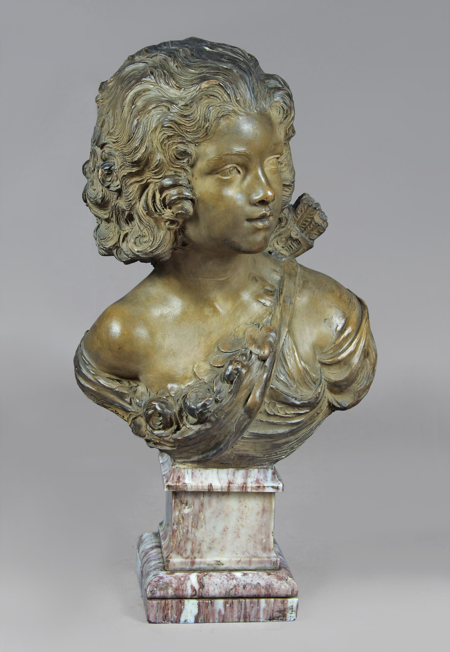 Escultura de terracota patinada. Firmada Fernand CIAN París y fechada 1923 en la parte trasera. Base de mármol rosa veteado.