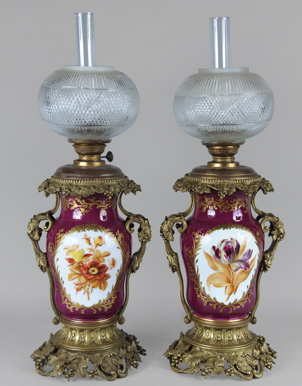Originalmente a kerosene. Decoración pintada a mano sobre fondo color granate. Dos reservas cada uno con figuras de querubines y flores. Base, asas y montura de finos bronces cincelados. Tulipa y tubo de vidrio. Pieza adaptada con instalación eléctrica. Una con restauración en la boca.