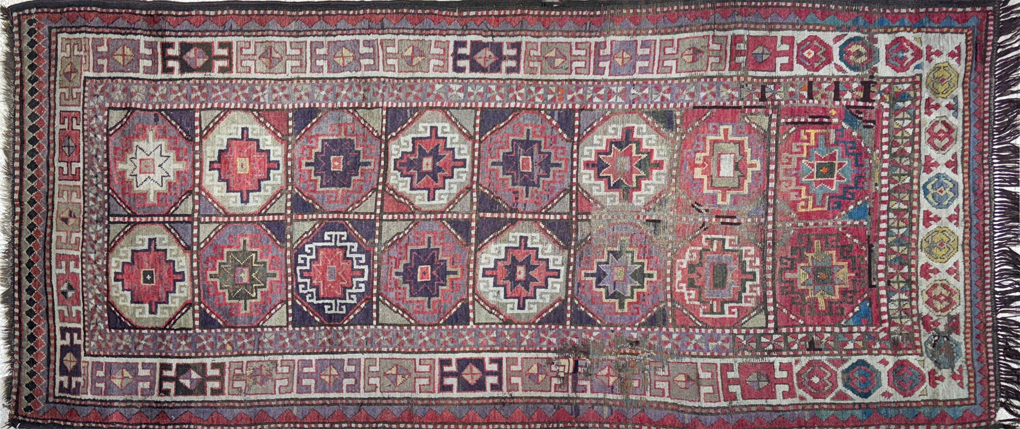 Campo central con dos hileras de dibujos geométricos en tonos variados. Amplia guarda formada por tres franjas. Pequeña avería lateral.