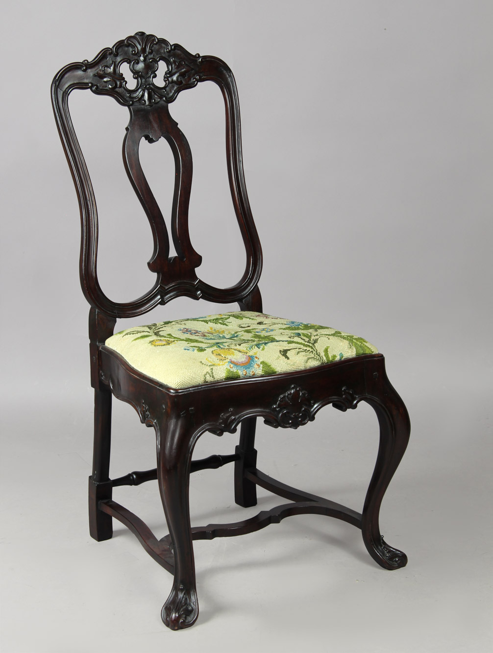 Ejecutada en madera de jacarandá. Decoraciones talladas con motivo vegetal en los apoyos, la cintura y el coronamiento del respaldo. Asiento a bastidor tapizado en gros point con diseño de flores y hojas en tonos polícromos sobre fondo beige.