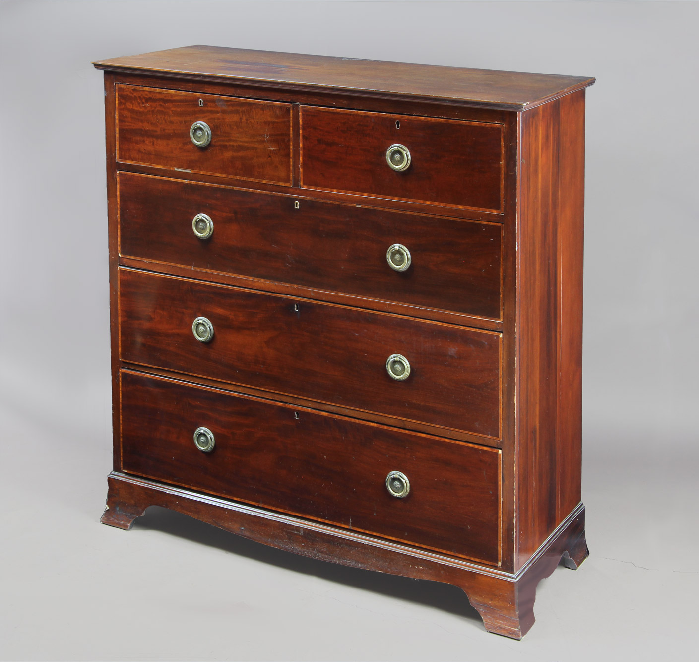 Construida en madera de caoba. Frente recto con tres amplios cajones de tamaños progresivos y dos más pequeños a una misma altura en la parte superior. Filetes rectos formando recuadros en madera clara. Tiradores de bronce cincelado y patinado.