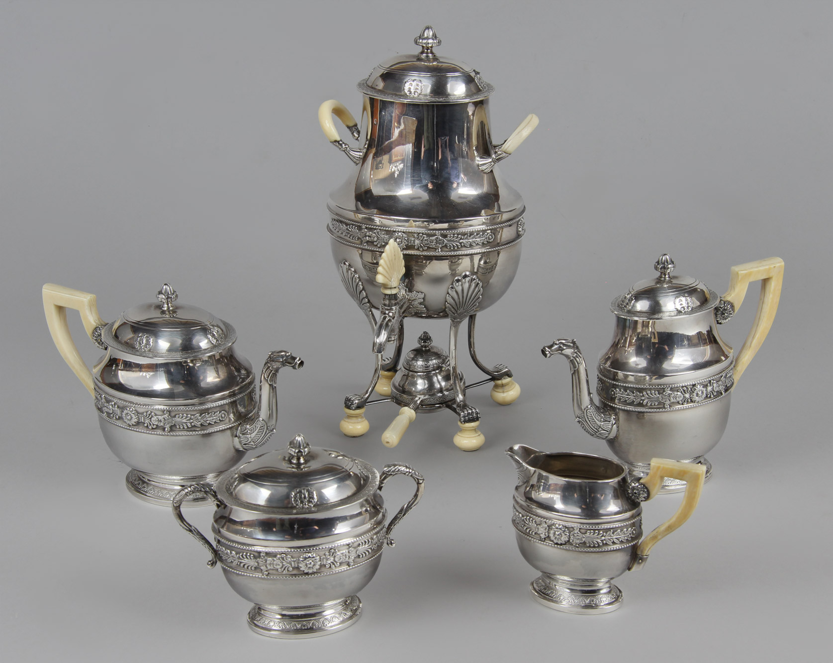 Cuerpos lisos. Guarda central y detalles cincelados en relieve con motivos vegetales. Picos zoomorfos. Detalles de marfil. Compuesto por samovar con calentador, tetera con tapa, cafetera con tapa, azucarera con tapa y jarrita lechera. Son cinco piezas en total.