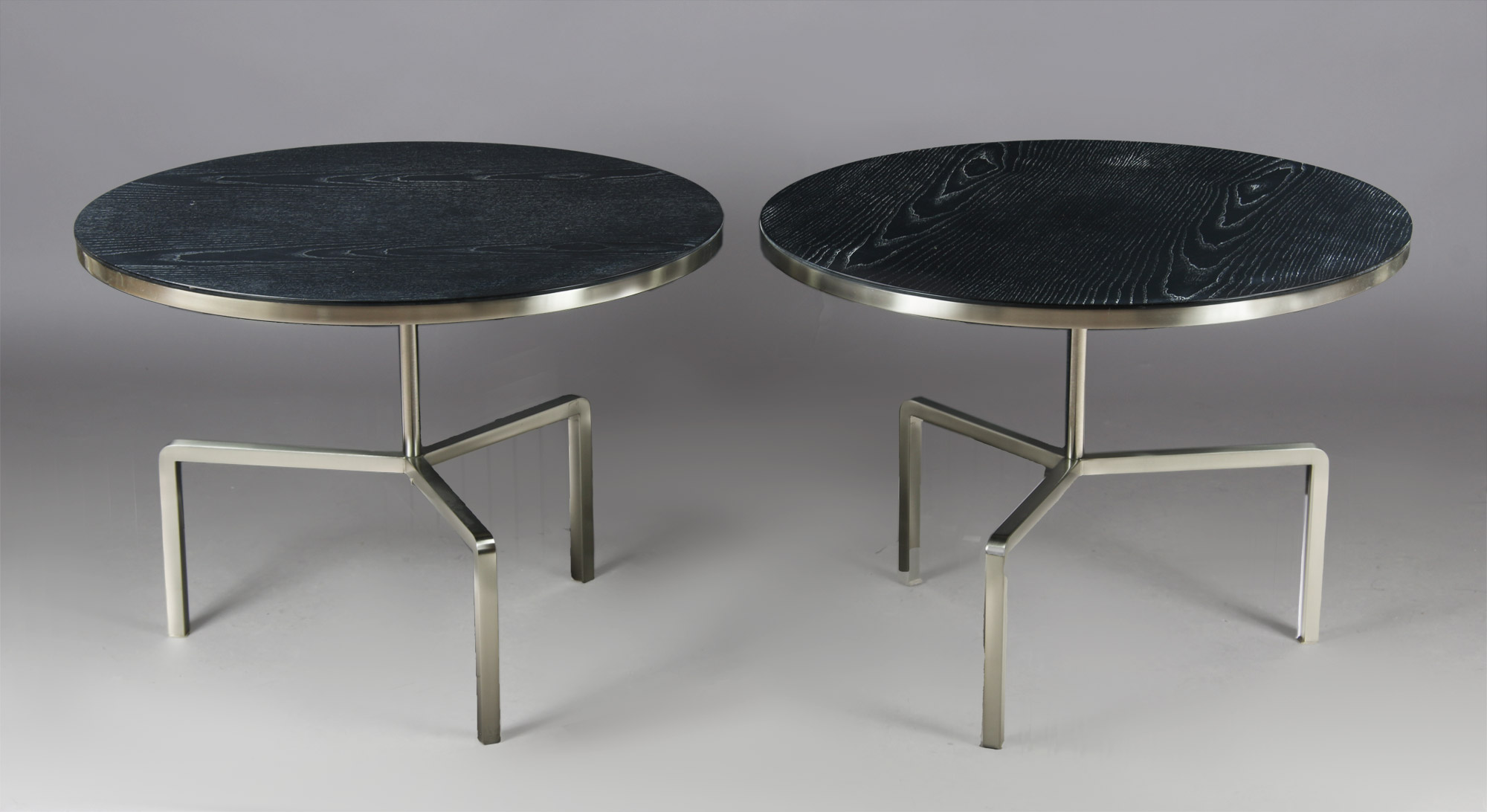 Modelo "ZEKE". Par de mesas circulares con armazón de acero empavonado. Pie de trípode. Tapa de melamina negra con veta simulando madera.